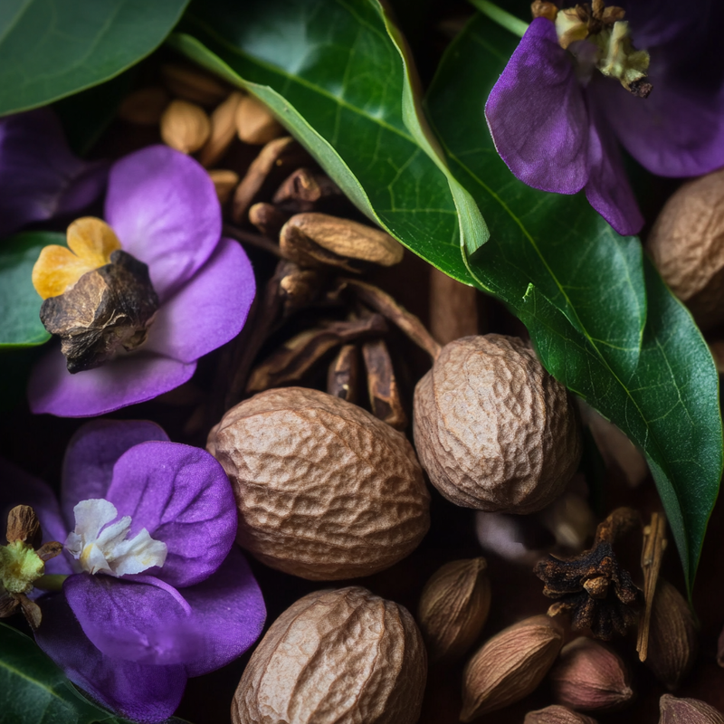 This sophisticated fragrance opens with an aromatic blend of Coriander, Indonesian Nutmeg, and Indian Cardamom Oil, delivering a warm, spicy introduction that awakens the senses. At its heart lies a lush fusion of Egyptian Violet Leaves Extract, Geranium Leaves Oil, and creamy Sandalwood, evoking an earthy yet refined character. The base reveals a sensual finish of Patchouli, smooth Benzoin, and rich Vanilla, creating a deep, comforting trail.