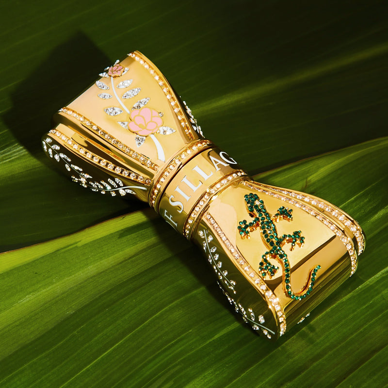This lipstick case is plated in luminous yellow gold and adorned with over 300 hand-placed Swarovski® crystals. Refillable with your favorite House of Sillage lipstick and presented in a vegan leather case with a dust bag, it’s beauty that lasts inside and out